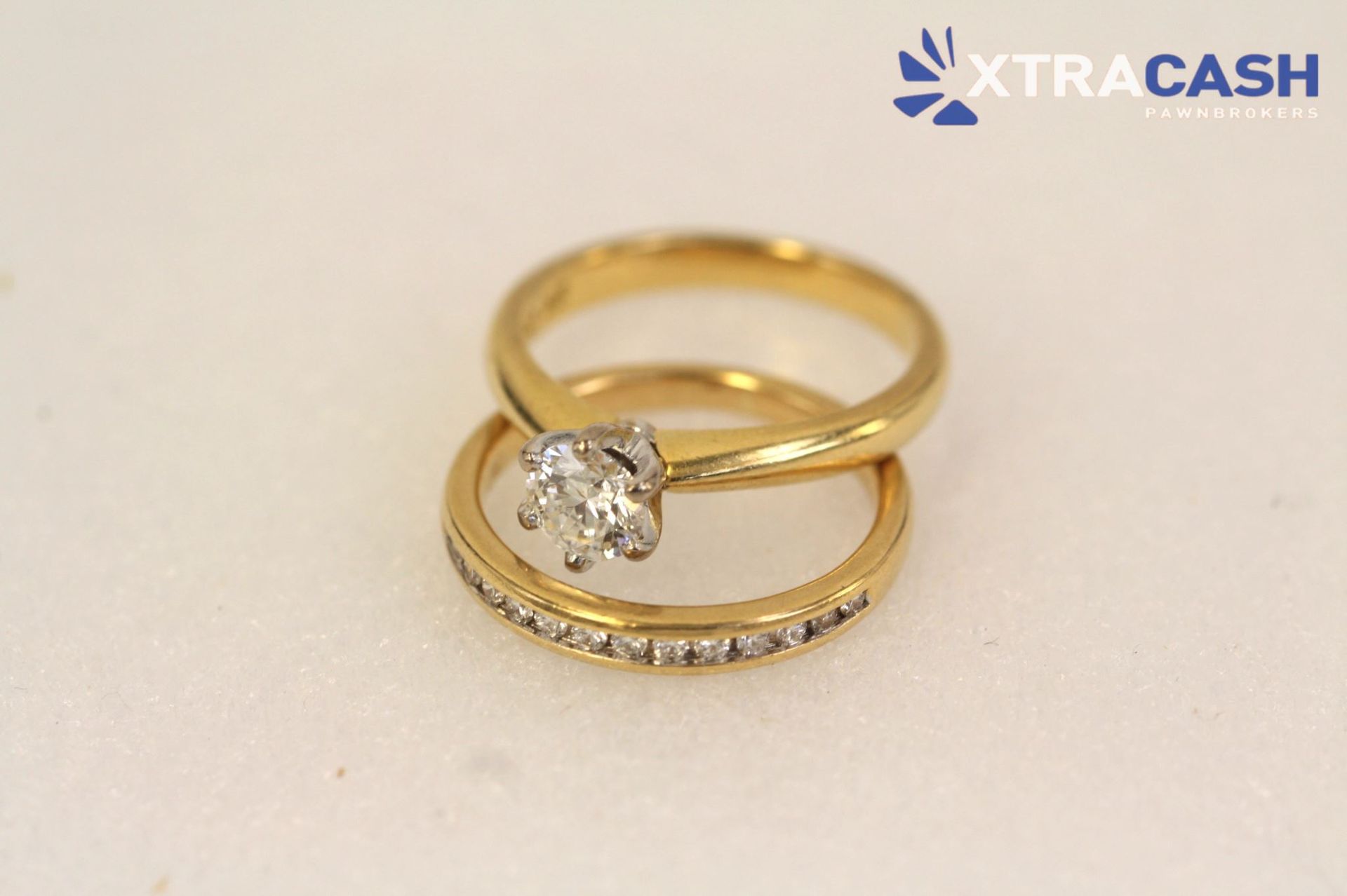 The wedding ring consists of 14 channel set round brilliant cut natural diamonds in a yellow gold slightly tapered band with a half round profile.