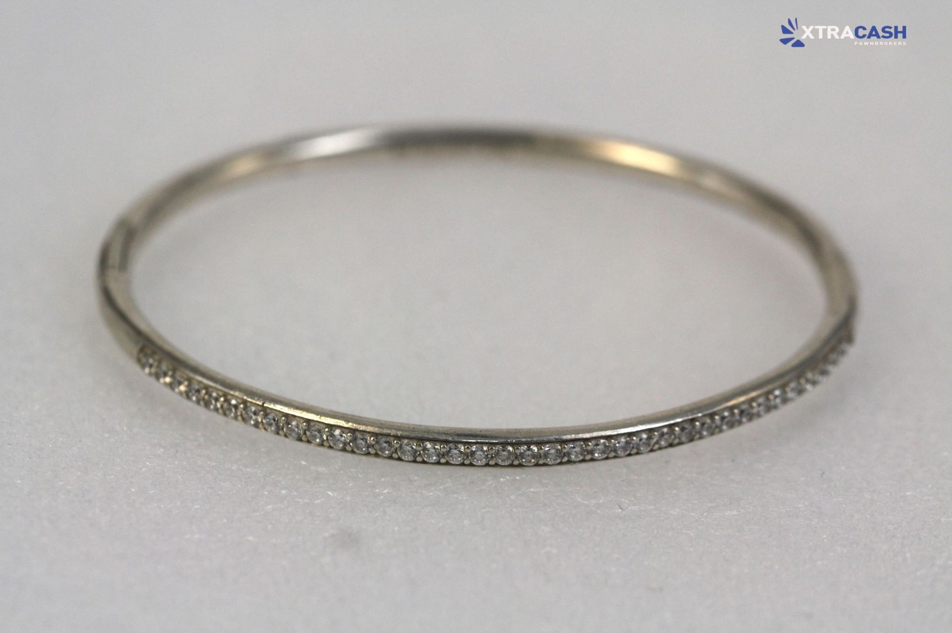 Sparkle gorgeously with this bangle designed to sit delicately around your wrist. Flawlessly crafted in sterling silver for a beautiful shimmer, it is enhanced with cubic zirconia gemstones that provide a glittering flair. A graceful accessory that can bring you from days in to nights out.